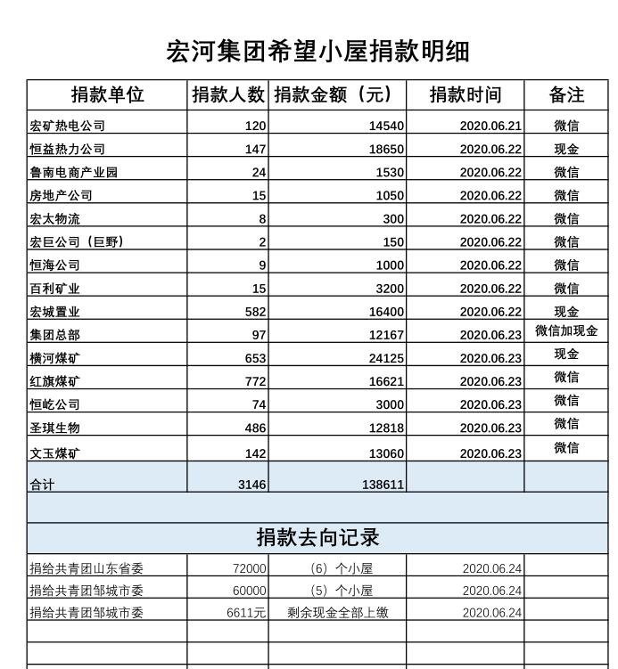 为帮助更多的适龄困境儿童实现梦想,响应山东团省委、山东省青联实施“希望小屋”儿童关爱行动募捐倡议, 按照乐动平台党委安排,乐动平台团委组织动员广大干部职工踊跃捐款,齐心协力汇聚爱心传递对贫困儿童的关爱,为更多有需求的儿童奉献爱心,帮助他们打造渴求已久的学习生活空间。 6月23日,共筑“希望小屋”,捐建逐梦空间——宏河乐动平台“希望小屋”儿童关爱行动募捐仪式,在乐动平台总部举行。 据统计,宏河乐动平台希望小屋爱心捐款活动共筹集到爱心捐款:138611元。其中,捐款所得款项统一汇缴至共青团山东省委、共青团邹城市委希望小屋工程项目,定向给邹城市希望小屋项目建设。明细如下: 近年来,宏河乐动平台积极关注并致力于社会公益活动,通过党、政、工、团群体组织积极摸排协调并解决贫困职工家庭问题,特别是贫困残疾人员家庭无独立居住和学习环境孩子的教育问题。在以往金秋助学、爱心送考、精准扶贫、慈心一日捐、抗疫捐款等工作及公益活动中,乐动平台秉承“幸福员工、铸就未来、服务社会、温暖人间”的企业使命,主动承担社会责任,持续关心关注孩子们的生活和教育问题。希望通过此次为“希望小屋”的捐款,帮助更多孩子们健康成长。 |